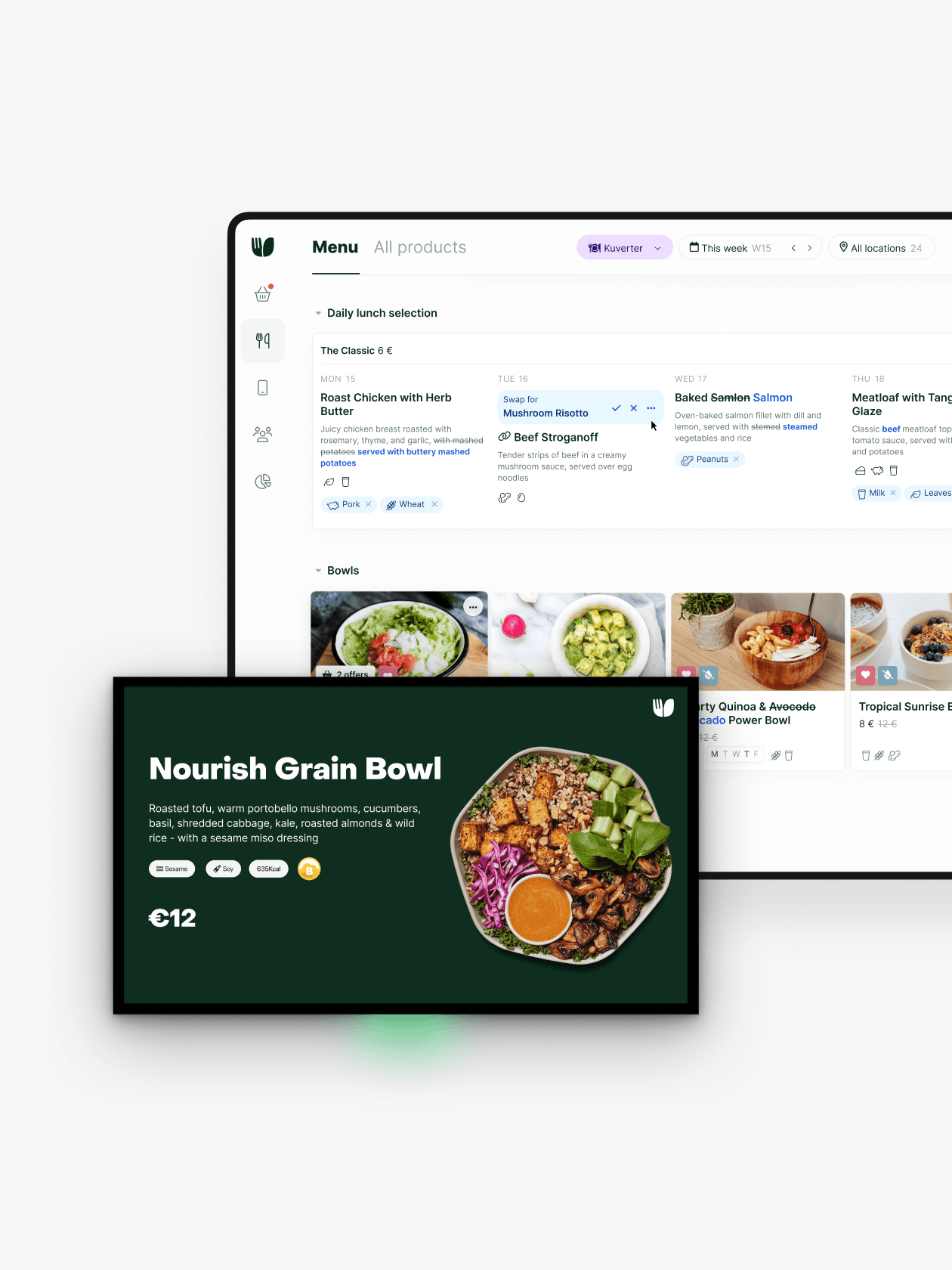 Show menus in the app, making it instantly clear what’s on offer this week, with key details like nutrition, CO2, allergens, and more. Customers can favourite meals and use filters to see what’s relevant to them.
